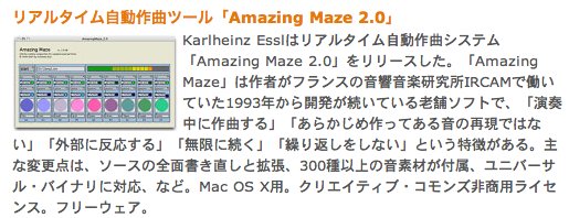 Amazing Maze è un programma in grado di generare 'musica' casuale, con alcune caratteristiche interessanti, tra le quali la capacità di non ripetersi mai e di comporsi al momento stesso in cui suona.