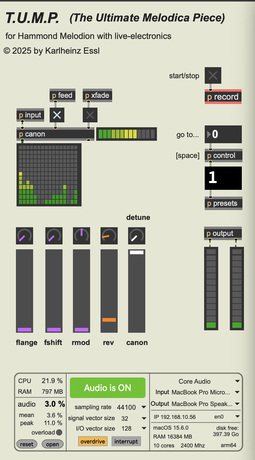 To record the piece, click on the record button ("start/stop") at the top of the main window. Two sound files will be created: a stereo sound file "TUMP_xxxxxx.aif" containing the output of the piece, and a mono sound file "Melodica_xxxxx.aif" containing only the unprocessed sound of the melodica. When the piece is finished, click the toggle again to stop recording.