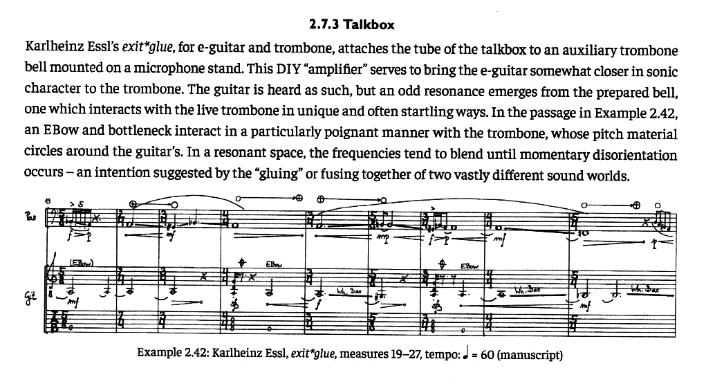 Karlheinz Essl's exit*glue, for e-guitar and trombone, attaches the tube of the talkbox to an auxiliary trombone bell mounted on a microphone stand. This DIY "amplifier" serves to bring the e-guitar somewhat closer in sonic character to the trombone. The guitar is heard as such, but an odd resonance emerges from the prepared bell, one which interacts with the live trombone in unique and often startling ways. In the passage in Example 242, an EBow and bottleneck interact in a particularly poignant manner with the trombone, whose pitch material circles around the guitar's. In a resonant space, the frequencies tend to blend until momentary disorientation occurs - an intention suggested by the "gluing" or fusing together of two vastly different sound worlds.
