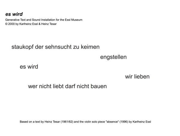 "Stirnwand -Karlheinz Essls und Heinz Tesars Installation es wird im Foyer: In der Mitte steht eine 1.60 Meter hohe Säule mit 40 Zentimeter Durchmesser. Ein grauer iMac macht im Moment Musik. In jedem Moment. Vom 1. November bis zum Ende des Festivals. Ein unendlicher Prozess, ohne Repetitionen. Ein Computerprogramm dekonstruiert Heinz Tesars Text und setzt ihn neu zusammen. Der musikalische Text erhält ein Pedant. Eine Aufnahme von Karlheinz Essls Violinsolostück absence 1999 von Irvine Arditti bei WIEN MODERN gespielt, wird mit dem gleichen Verfahren wie Tesars Text bearbeitet. Der Computer schaltet zwischen den beiden Kompositionen hin und her, zwischen dem expressiven, emotional aufgeheiztem Text und dem hysterischen Überschwappen von absence. Aus Dekonstruktion konstruiert der Computer eine Klangarchitektur. "Die Ordnung in sich ist absolut, doch in ihr kriecht es." Der Klangraum wird gleichzeitig zum Lesesaal. Am Bildschirm flackern synchron zur akustischen Wiedergabe die betreffenden Partikel von Tesars Text in Buchstaben auf.