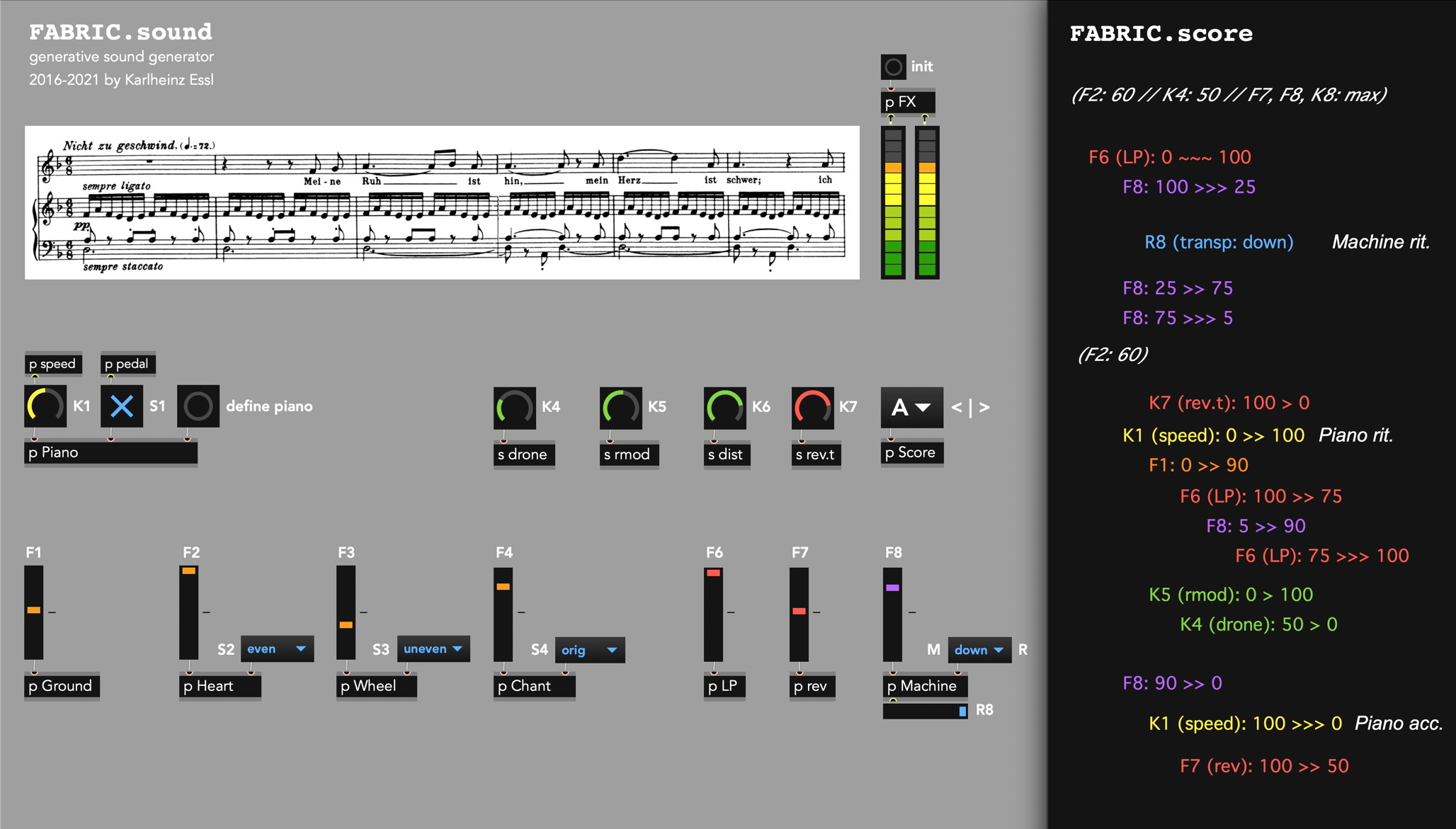 The music develops from two contrasting sound materials - a sewing machine noise and fragments from Schubert's piano song "Gretchen am Spinnrade" - and builds up to a highly energetic concentration of sound that hits the audience with full force as a "wall of sound". The sound level and the visuals, also conceived by Karlheinz Essl as an algorithm, are in a constant, slowly changing process of transformation during the live performance. In between, there are lyrical sections with piano improvisations, which - also carrying the seeds of change - dramatically condense into new forms and qualities of experience. In the spirit of alchemistic transmutation, the substances also change here: The "factory dirt" and the hard work of the textile workers become "gold" - and vice versa.