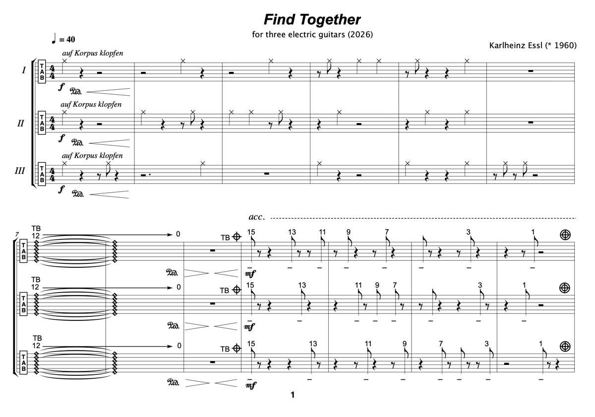 A piece for three custom-tuned electric guitars lying on a table. The strings are neither fingered nor plucked. Instead, a tone bar and an E-Bow are used to make the strings vibrate.