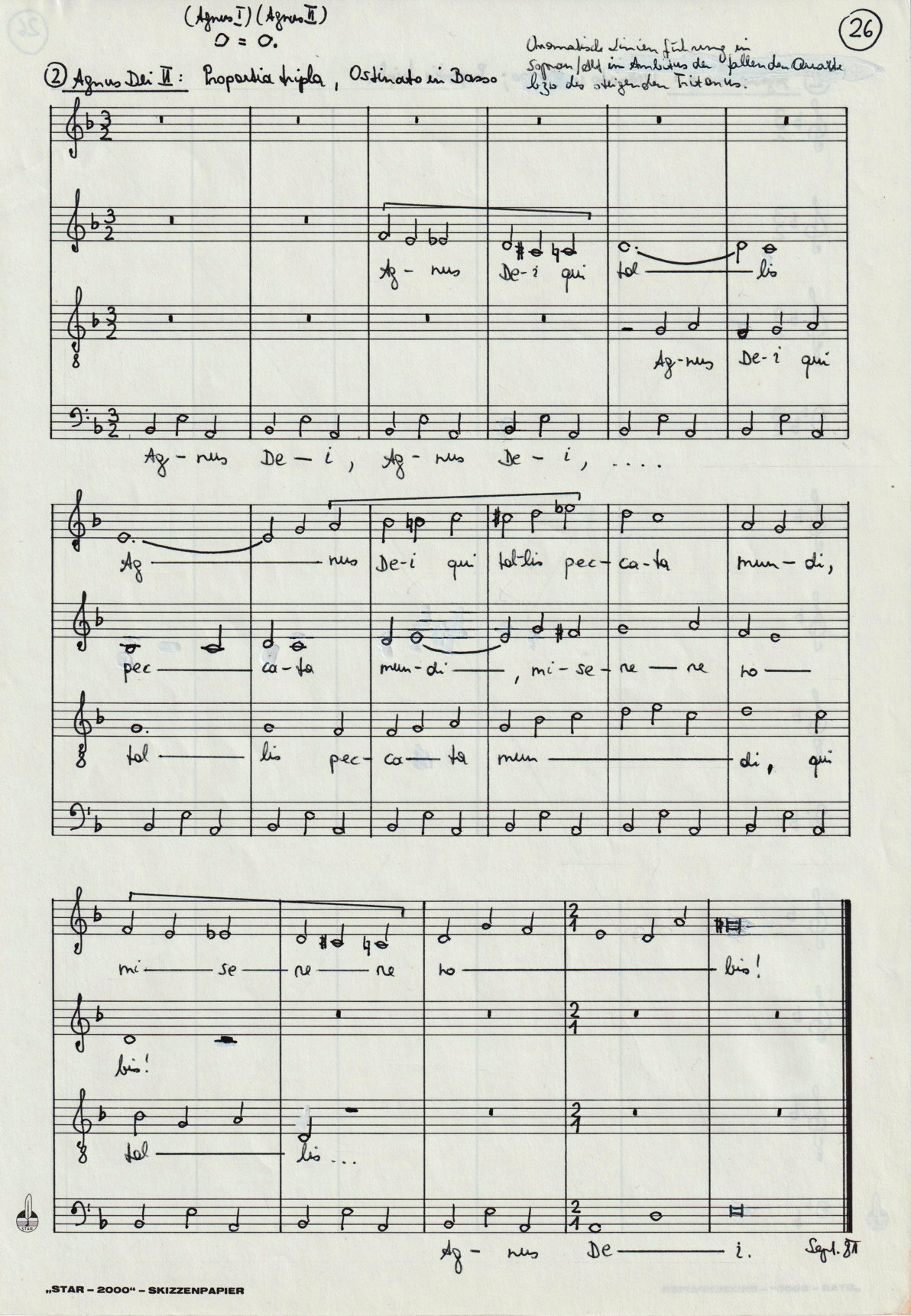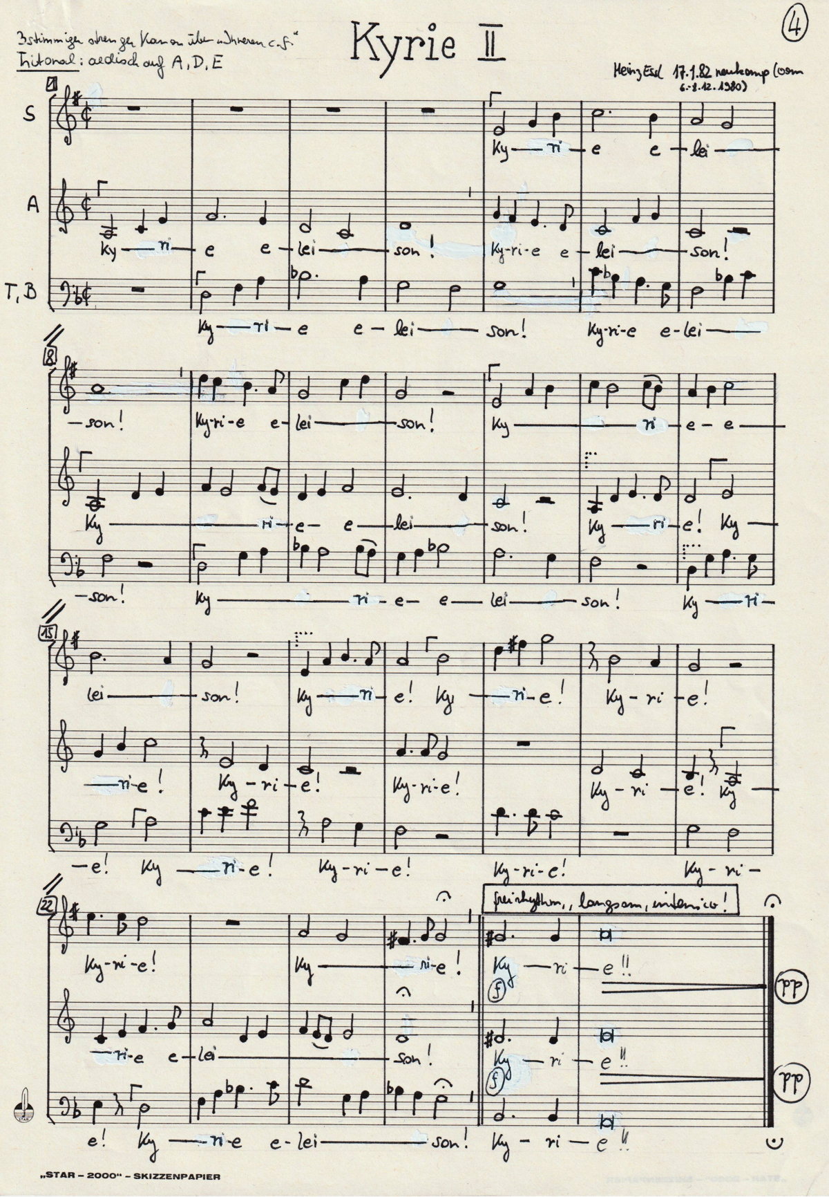 Mit dem Beginn meines Musikwissenschaftsstudiums hatte ich meine musikalische Unschuld verloren und war tief in die Welt des Mittelalters hinabgetaucht, die mich unendlich faszinierte. Wie ein Archäologe entdeckte ich dort fremdartige Musiken, die nicht allein als Klang in Erscheinung traten, sondern voll geheimer Botschaften waren, verklausuliert in Ziffern und Zeichen. Und wiederum war es die Lust, dieses empirisch angeeignete Wissen selbst auszuprobieren. Daraus entstand 1980-81 die Missa Aeolica für vierstimmigen gemischten Chor, das einen sogennanten "inneren Cantus firmus" als Ariadnefaden aufweist, der sich durch alle fünf Messteile in mannigfachen Erscheinungsformen schlängelt. Die gesamte Kompositions ist voller kontrapunktischer Verrücktheiten, deren Höhepunkt das "Kyrie II" darstellt - ein strenger dreistimmiger Kanon in drei verschiedenen Tonarten gleichzeitig. Uraufgeführt wurde dieses Chorwerk vom "Kammerchor Kontrapunkte Klosterneuburg" (wo ich begeistert mitsang) unter der Leitung von Erke Duit.