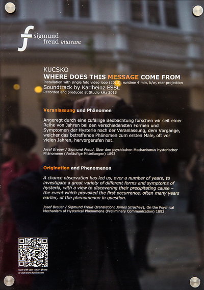 Botschaft und UrsacheDie Hand in Guido Kucsko's Videoinstallation where does this message come from transportiert keine bekannten Informationen. Unmotiviert und heftig bewegt sie sich, um dann wieder in völliger Ruhe zu verharren. Wir sehen eine Botschaft, aber sie entzieht sich der Deutung. Sie lässt keine Rückschlüsse auf den Absender, auf die Ursache der eindringlichen Bewegung zu. So entzieht sich das Symptom des Patienten der selbsterklärenden Information. Es geht um jene Symptome, deren Ursache und Ursprung Sigmund Freud beschäftigt haben.