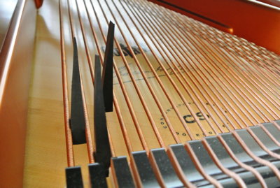 Put three rubber tuning wedges between the lowest strings of the piano as shown in the photo. By this procedure, the Bb and B string are entirely muted, whereas the C string is only half muted. Here you need to move the third wedge into a position where the octave partial of the C string will sound.Place the E-Bow exactly over the 3 strings of the middle D. Find a position along the string where the resulting sustain tone sounds best.